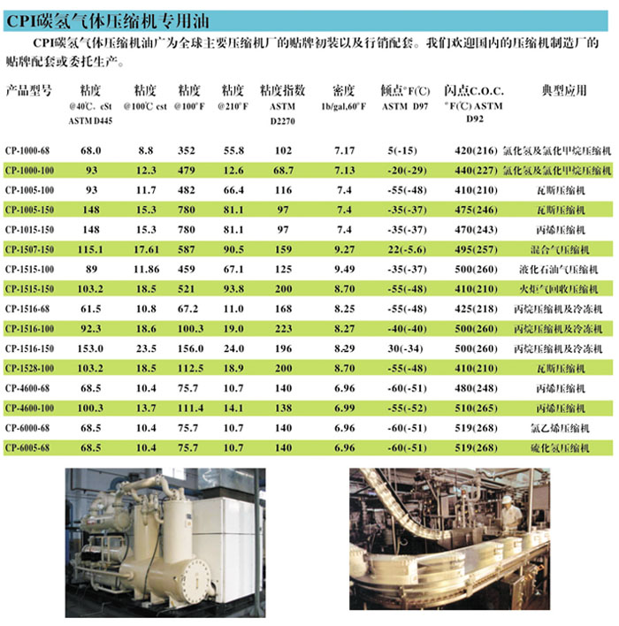 - 產品簡介: CPI-4100-100/CP-4100-100 系列產品是基于雙酯類合成基礎油調制而成的高品質的合成壓縮機油,它可提供極好的抗氧氣性…